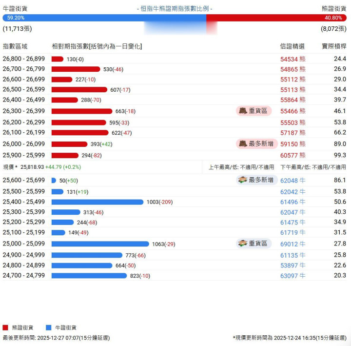 中信证券牛熊证街货分布图中的数据显示,熊证街货重货区在26300-26399区间,该区间最新熊证数量为633张,较上一交易日减少18张;最多新增在26000-26099区间,该区间最新熊证数量为393张,较上一交易日增加42张。